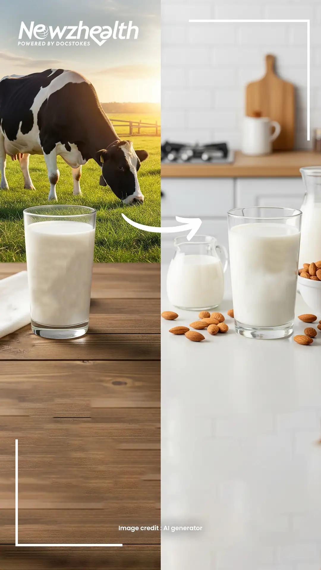 What's the difference? Cow’s milk is a traditional source of calcium and protein. Almond milk is a plant-based, dairy-free alternative made from ground almonds and water.